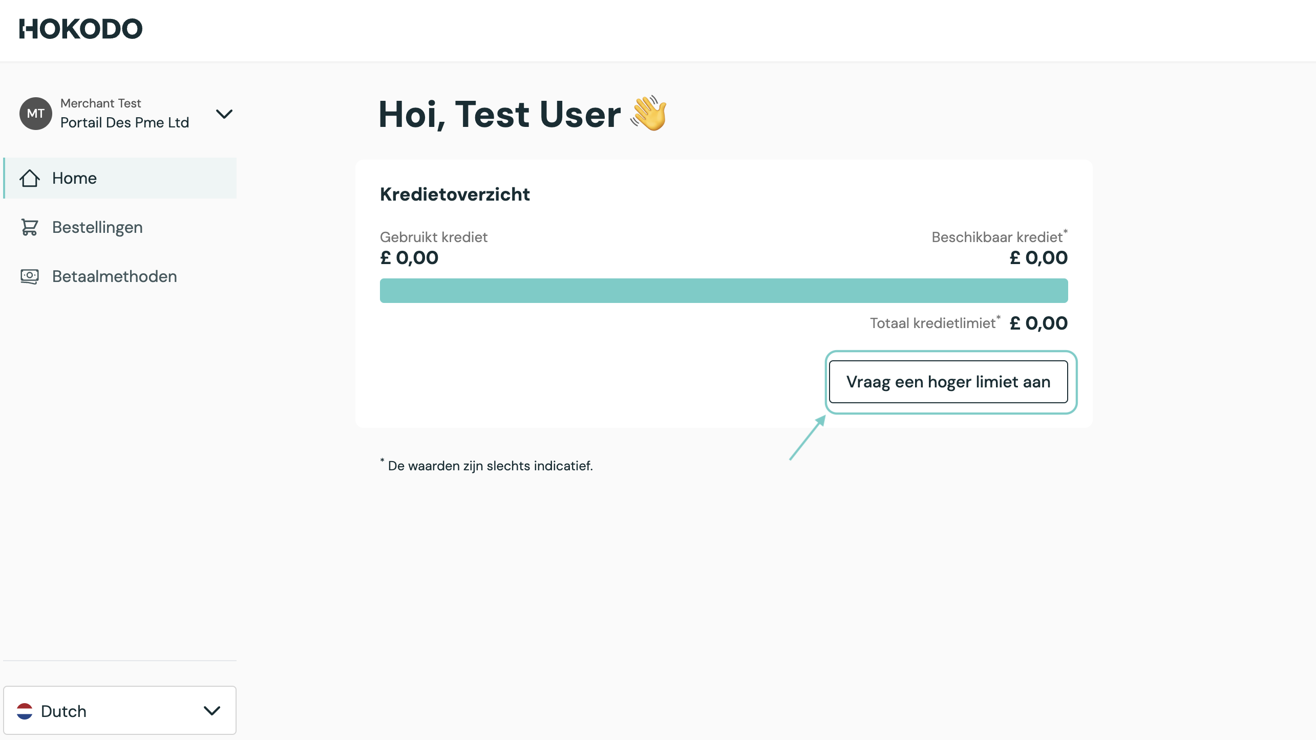 Als u geen kredietaanvraag kunt indienen (bijv. als de knop niet werkt), neem dan contact op met onze support via support@hokodo.co.